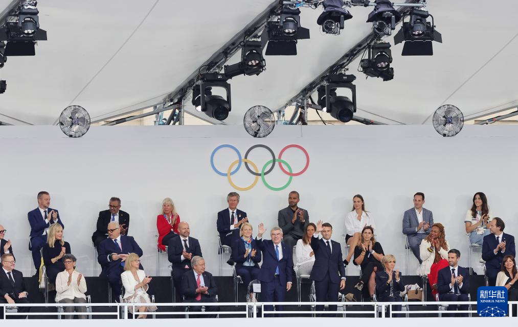 7月26日,国际奥委会主席巴赫(前排左五)和法国总统马克龙(前排右四)出席开幕式。新华社记者 沈伯韩 摄