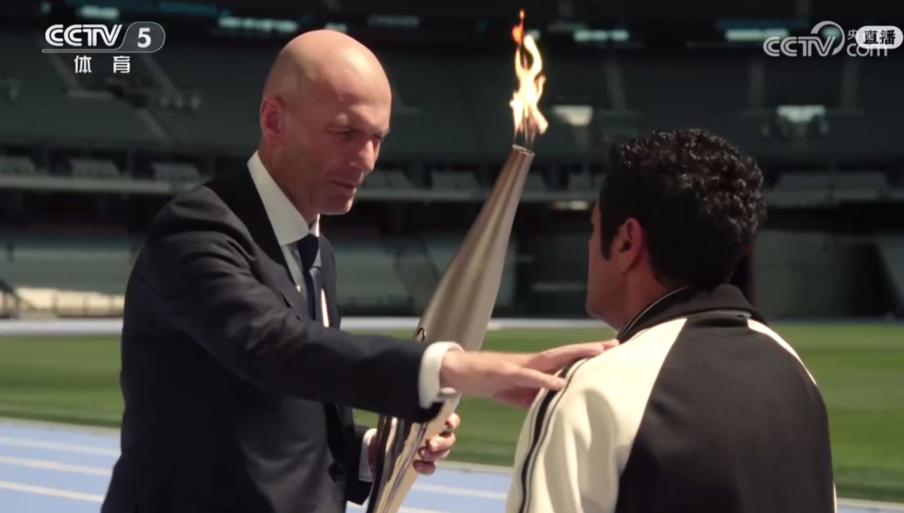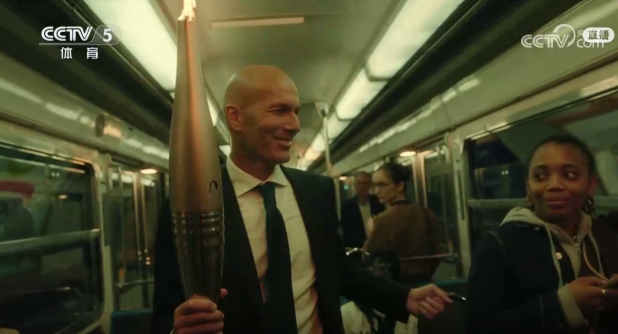 法国球星齐达内带着火炬穿过巴黎的大街小巷,随后三个法国少年将圣火带到塞纳河畔交给神秘火炬手。