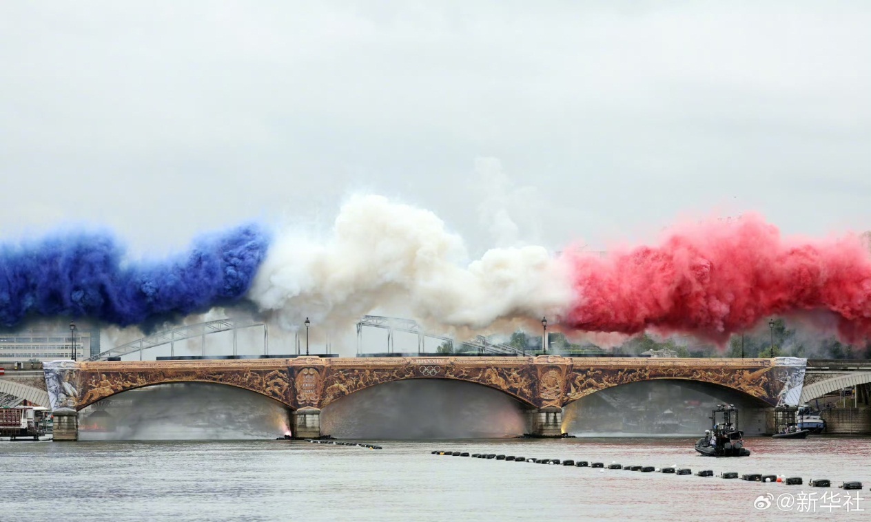 乒乓球运动员马龙和花样游泳运动员冯雨担任旗手,中国体育代表团运动员手举国旗,乘坐游船在塞纳河巡游。