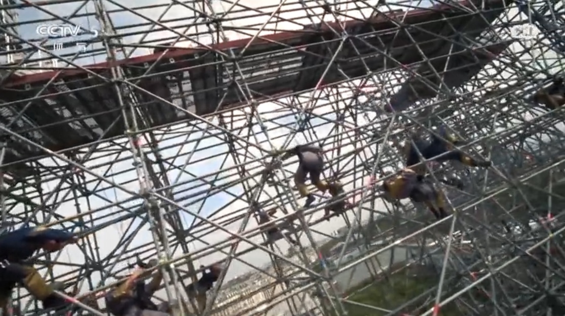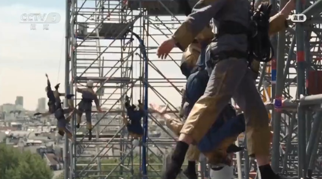 20名舞者在脚手架上舞蹈,火炬手降落在巴黎圣母院的脚下。巴黎圣母院是世界文化遗产,2019年失火后,目前正在修缮过程当中,预计于今年12月再度对公众开放。