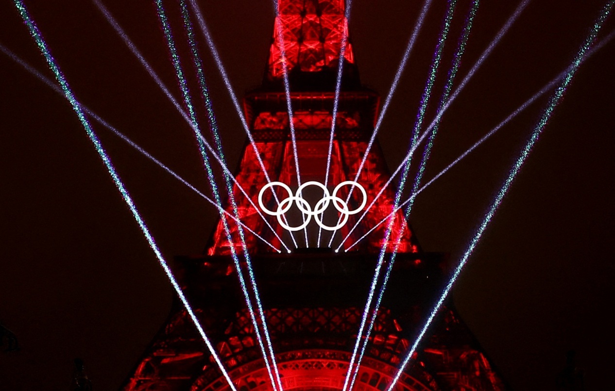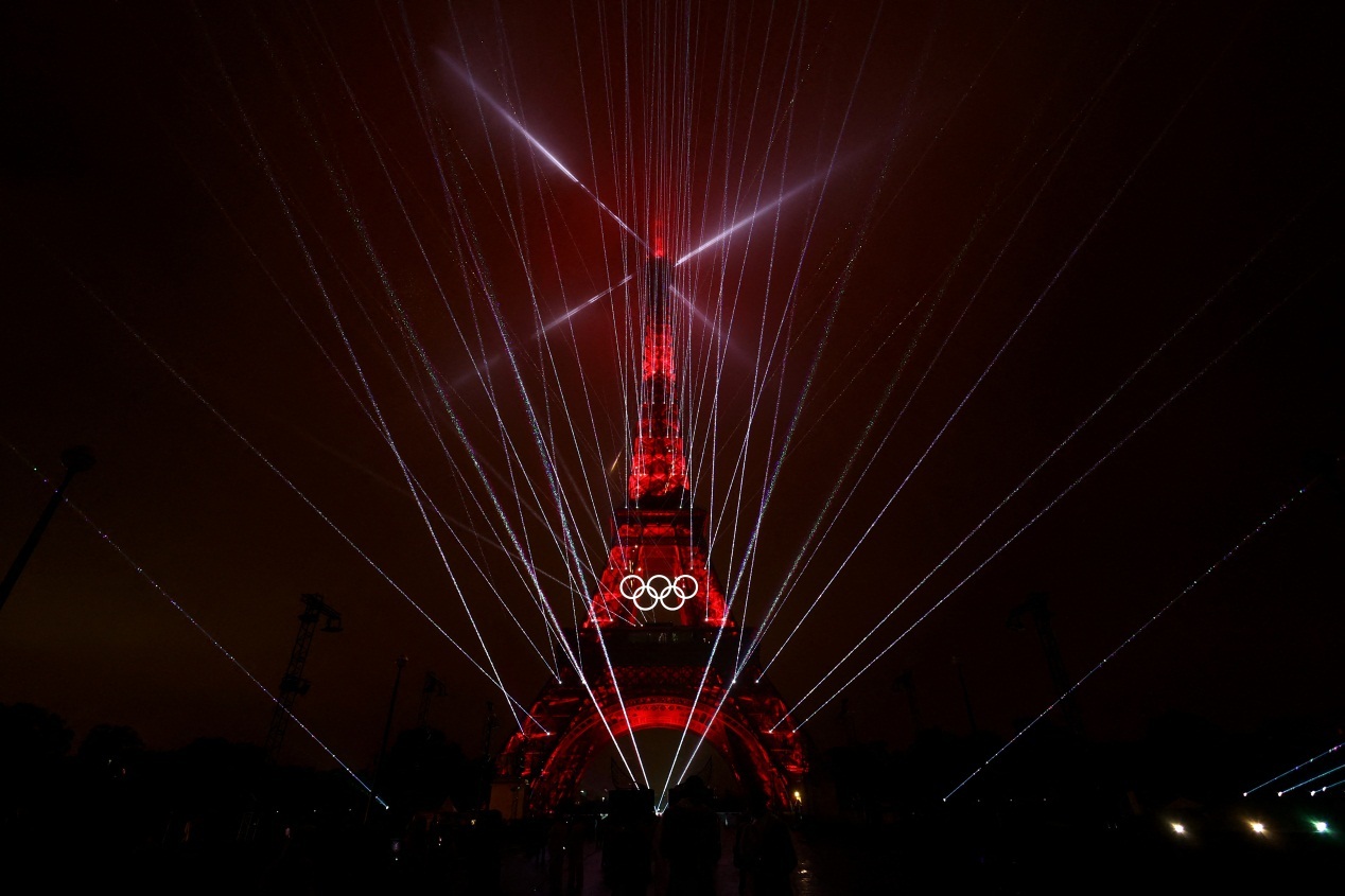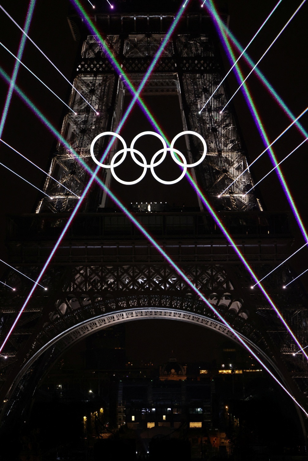 开幕式上,巴黎奥运五环与埃菲尔铁塔交相辉映。