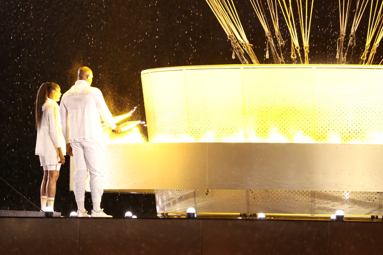 神秘火炬手将火炬交给法国传奇球星齐达内,随后火炬手们依次传递。火炬传递最后来到一个热气球前。这个热气球高30米,直径22米,底部的筐直径7米。这个热气球就是巴黎奥运火炬台。最后两名火炬手一起将奥运主火炬点燃,热气球腾空而起。