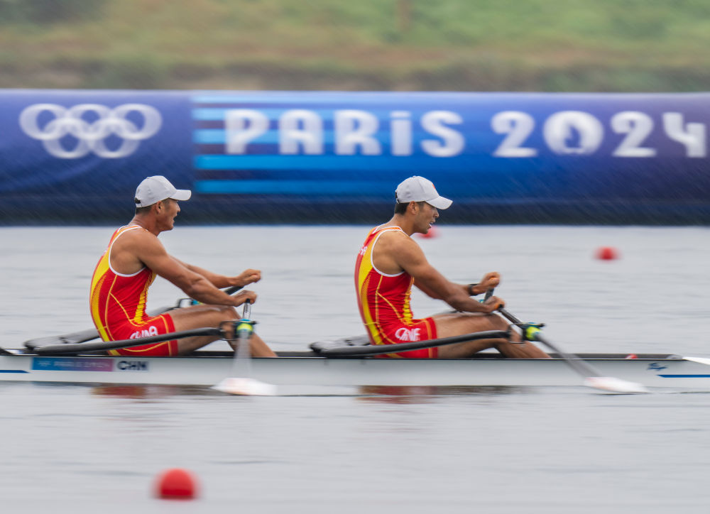 7月27日,中国队选手刘治宇(左)和阿迪里江·苏里坦在男子双人双桨预赛中。新华社记者 孙非 摄