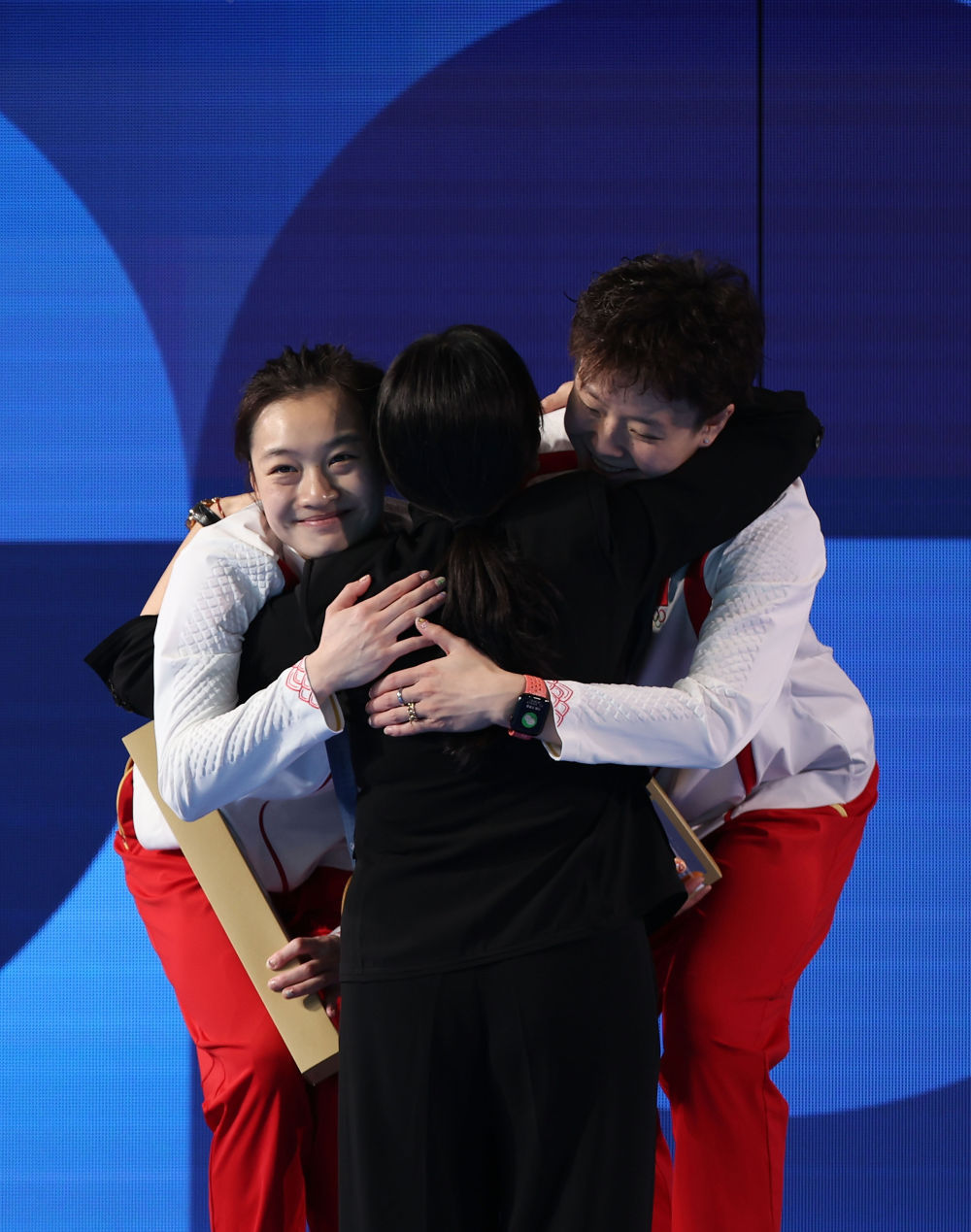 颁奖典礼上,世界泳联副主席、洛杉矶奥运会冠军周继红给两位姑娘大大的拥抱。自2000年悉尼奥运会跳水增设女子双人三米板项目以来,中国姑娘赢得了7枚金牌中的6枚。从2004年雅典奥运会开始,中国选手一直占据该项目的奥运最高领奖台,从未失手。