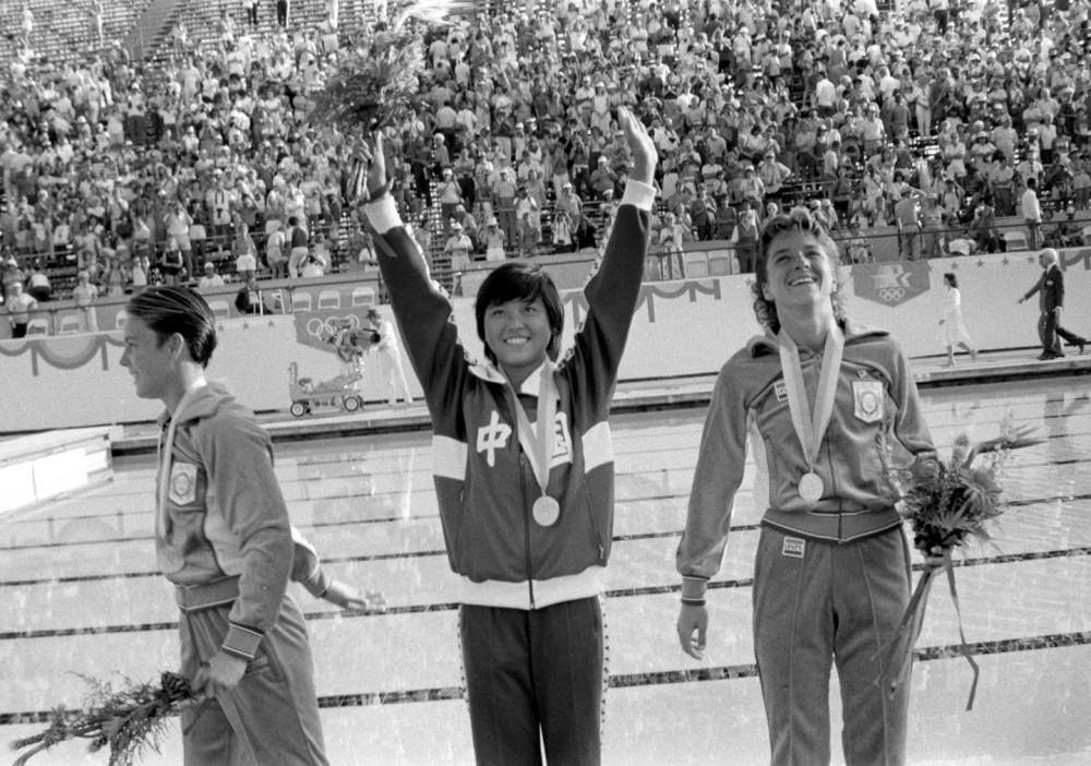 1984年8月10日,19岁的中国湖北选手周继红在第23届奥运会女子跳台跳水比赛中荣获冠军。新华社记者官天一摄(传真照片)
