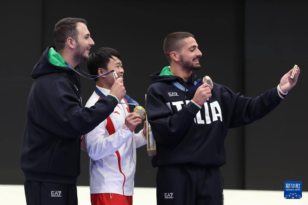 7月28日,冠军中国选手谢瑜(中)、亚军意大利选手费代里科·尼洛·马尔迪尼(左)和季军意大利选手保罗·蒙纳在颁奖仪式上自拍留影。新华社记者 赵丁喆 摄