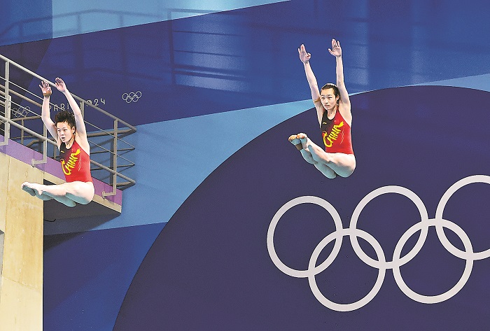 北京时间7月27日,在巴黎奥运会跳水女子双人3米板决赛中,中国选手昌雅妮(右)/陈艺文夺得金牌。新华社记者 张玉薇 摄