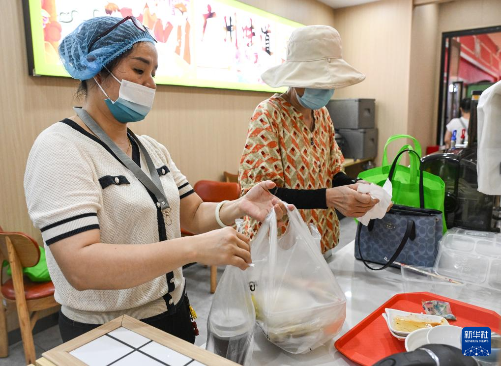 在广州市荔湾区的南源街道长者饭堂内,一名社工(左一)协助前来购餐的老年人打包饭菜(7月24日摄)。新华社记者 李贺 摄
