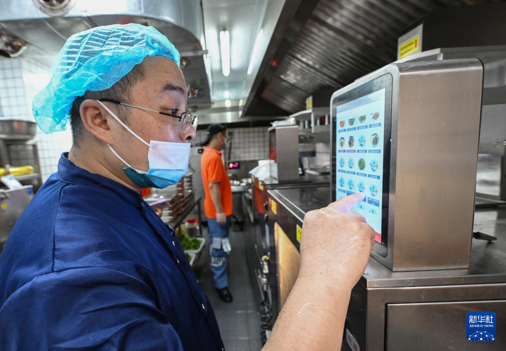 在广州市荔湾区的南源街道长者饭堂后厨,一名厨师使用炒菜机器人协助烹饪(7月24日摄)。新华社记者 李贺 摄