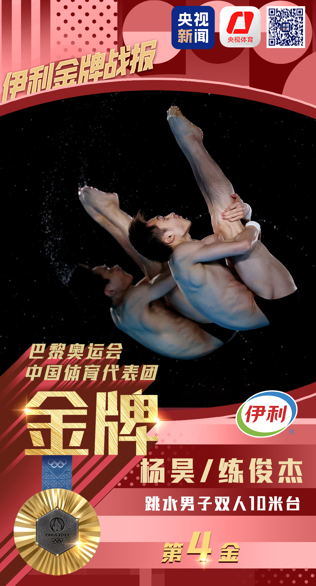 7月29日,在巴黎奥运会跳水男子双人10米台比赛中,中国组合杨昊/练俊杰夺得金牌。这是中国代表团在本届奥运会获得的第4枚金牌。