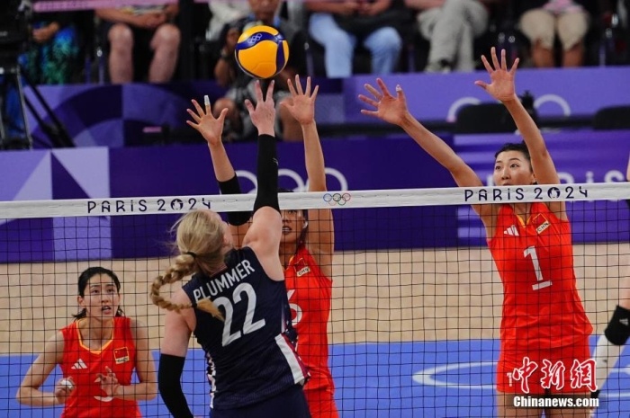 当地时间7月29日,在巴黎奥运会排球女子小组赛A组比赛中,中国队3比2战胜美国队,迎巴黎奥运会开门红。图为中国队球员在比赛中拦网。中新社记者 赵文宇 摄
