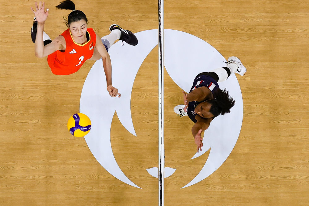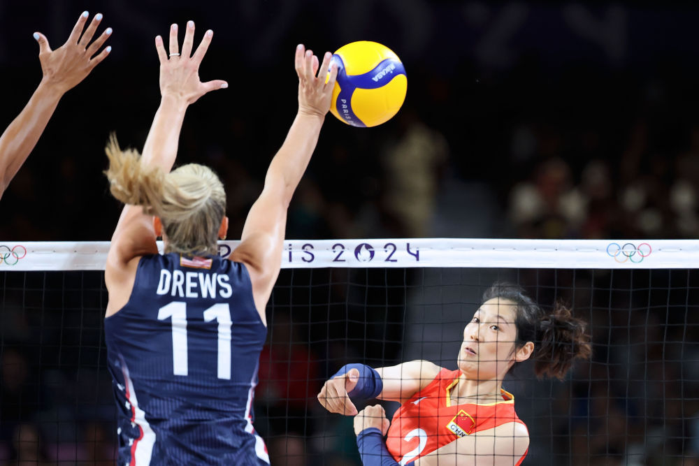 7月29日,中国队球员袁心玥(左)在比赛中扣球。新华社记者 陈益宸 摄