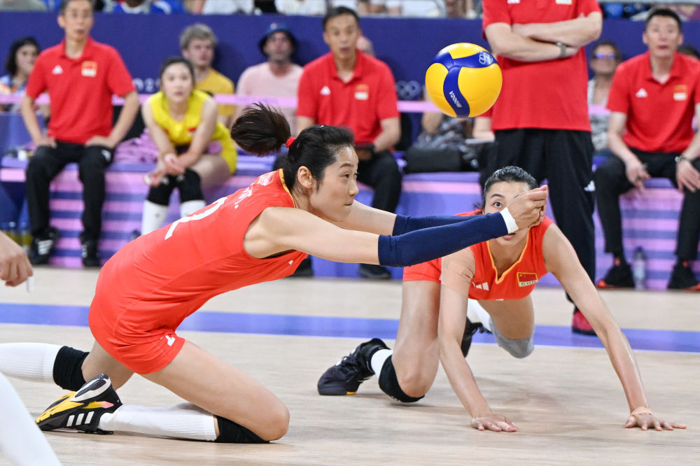 7月29日,中国队球员朱婷(左)在比赛中救球。新华社记者 鞠焕宗 摄