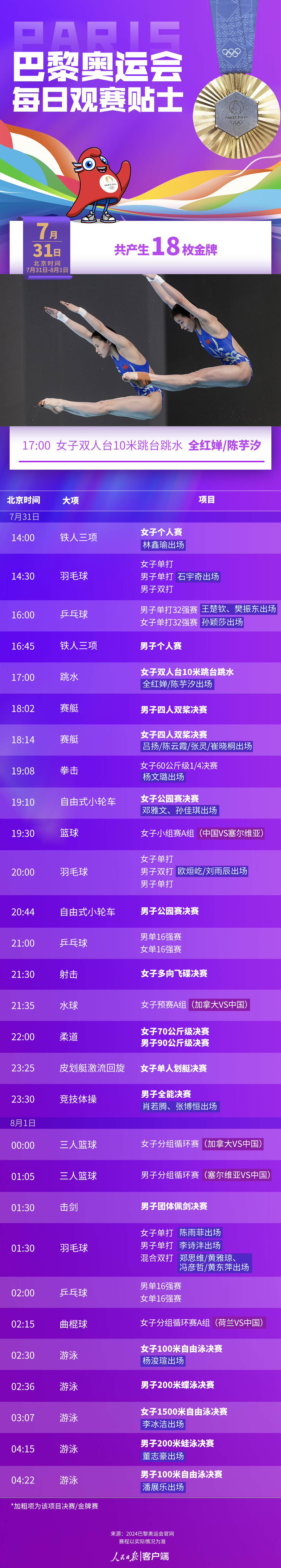 原标题:7月31日奥运看点丨全红婵/陈芋汐跳水女子十米台争金 中国游泳队冲击首金