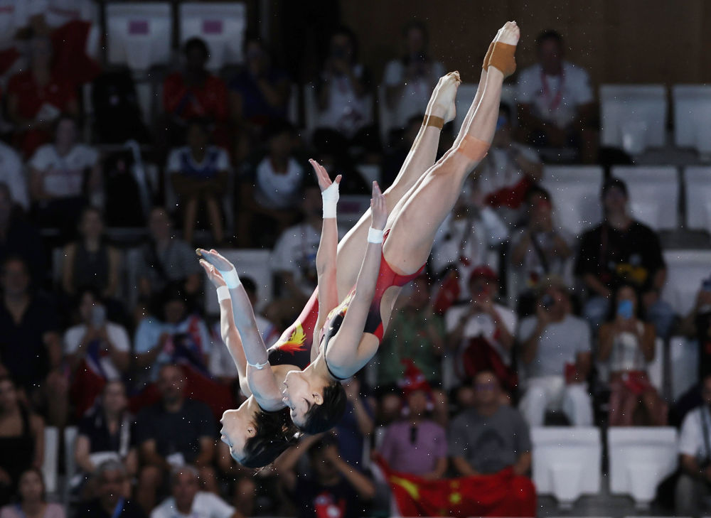 7月31日,中国选手陈芋汐(后)/全红婵在比赛中。新华社记者 李颖 摄
