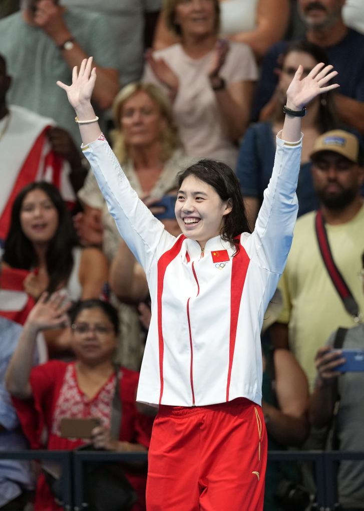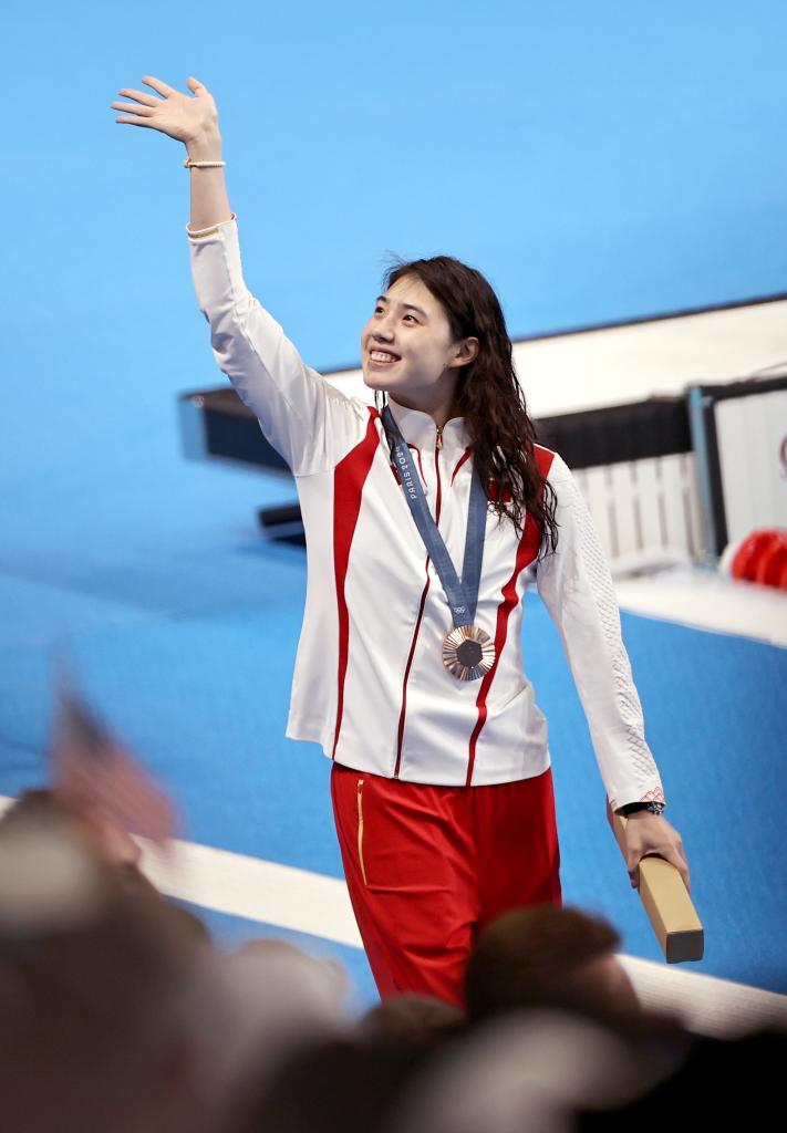8月1日,季军中国选手张雨霏在颁奖仪式后向观众招手。新华社记者 雒圆 摄
