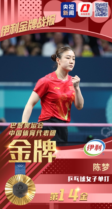 北京时间8月3日,在巴黎奥运会乒乓球女子单打决赛中,中国选手陈梦战胜队友孙颖莎,成功卫冕,夺得金牌。这也是中国代表团在本届奥运会上获得的第14枚金牌。