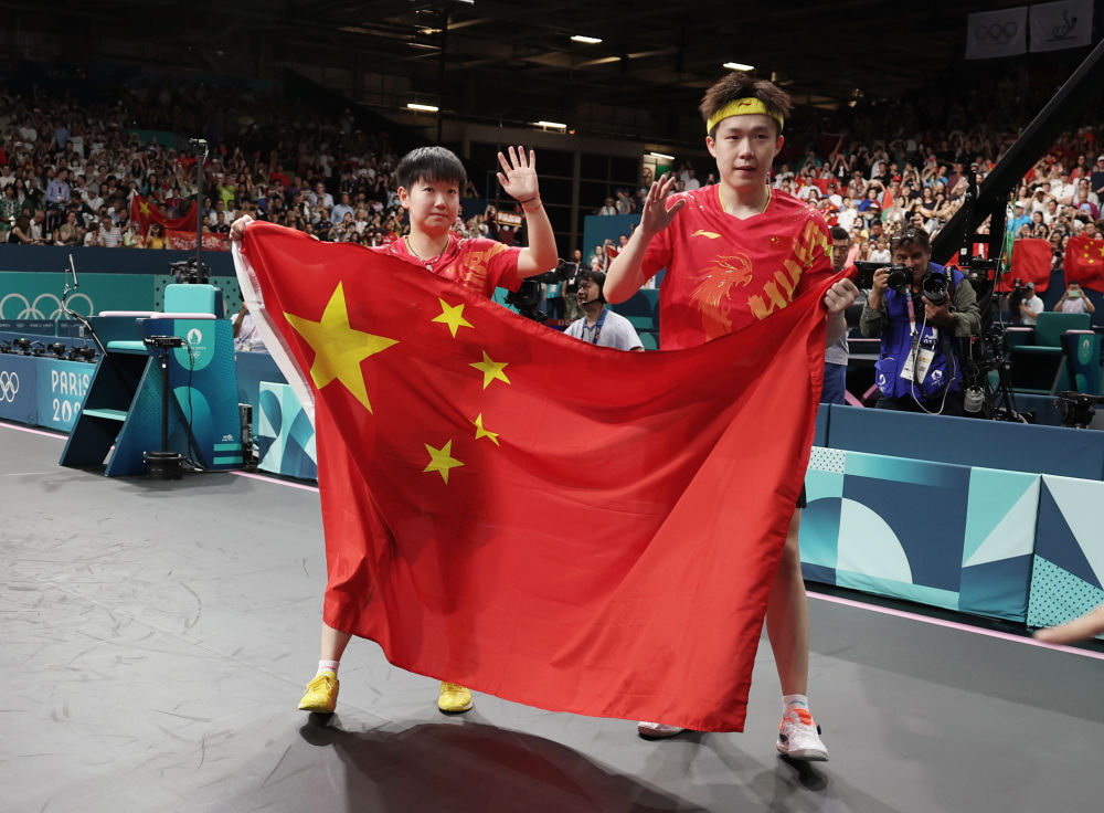 ↑7月30日,王楚钦(右)/孙颖莎在巴黎奥运会乒乓球混双决赛夺冠后庆祝。