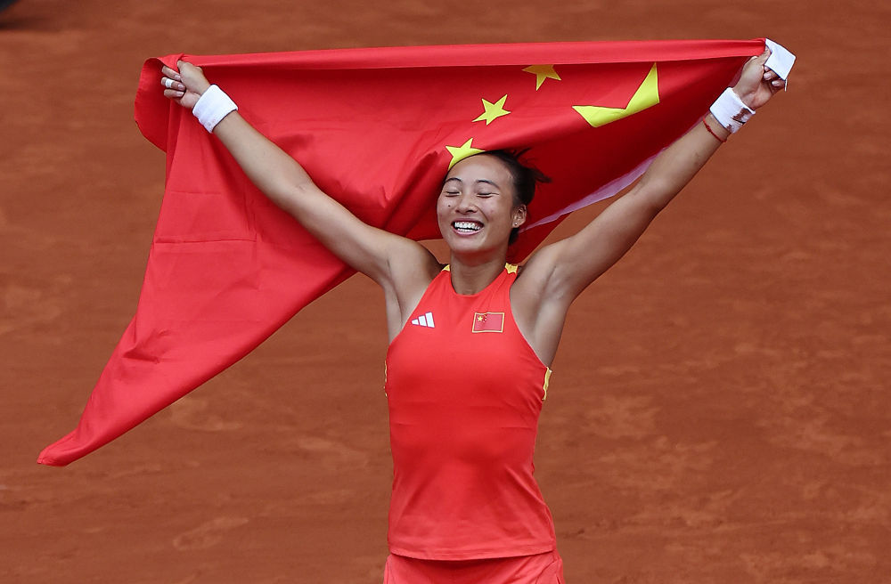 ↑8月3日,中国选手郑钦文在赢得网球女子单打金牌赛后身披国旗庆祝夺冠。