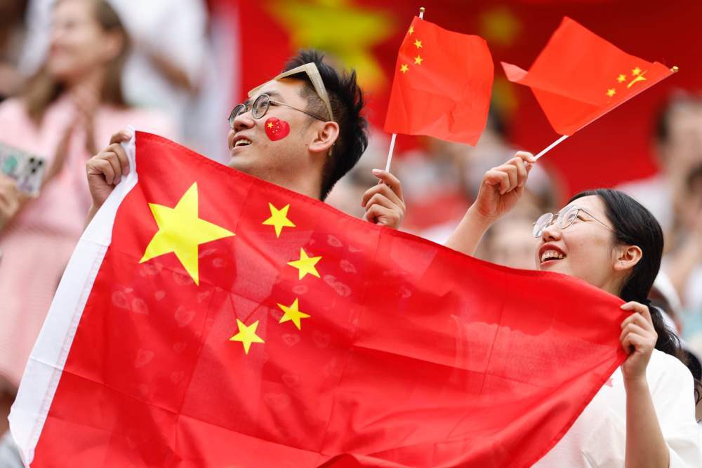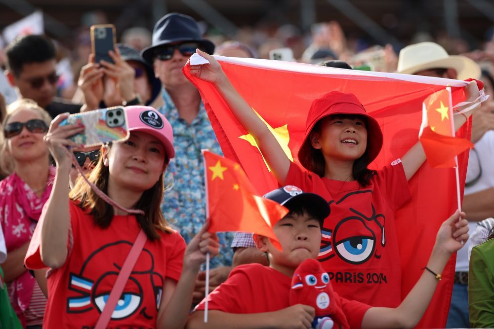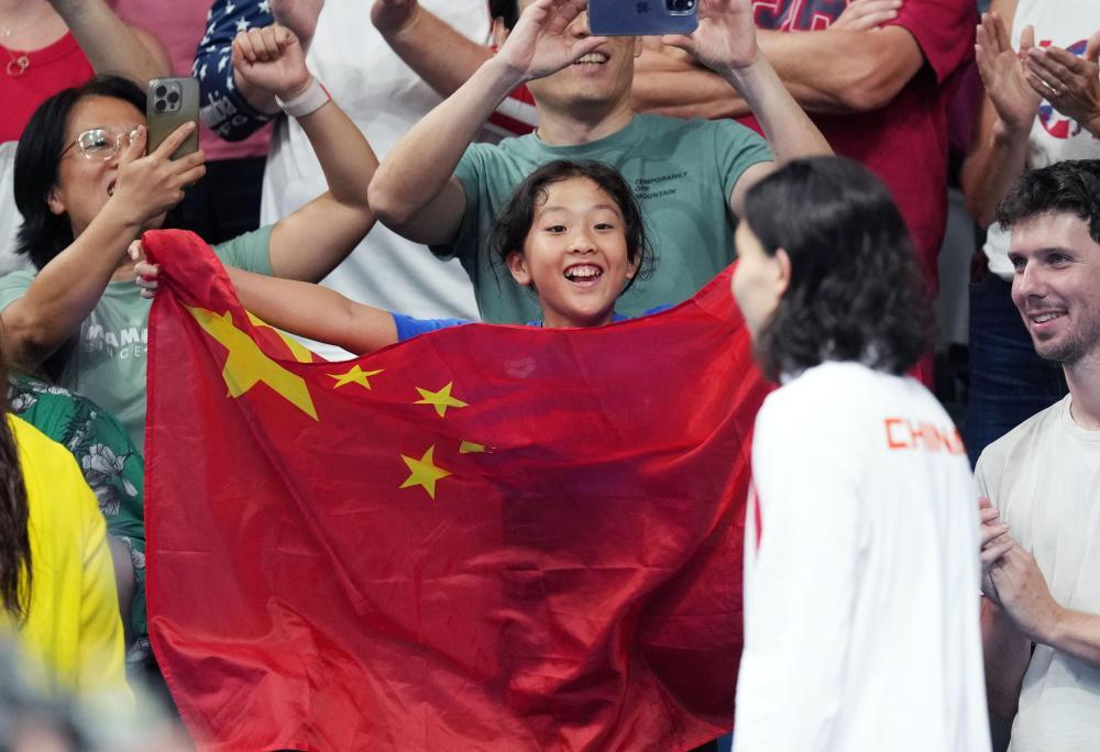 ↑8月1日,一位小观众在颁奖仪式后挥舞中国国旗。在巴黎奥运会游泳项目女子4x200米自由泳接力决赛中,中国队获得季军。