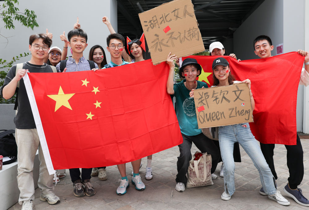 ↑8月3日,中国选手郑钦文的粉丝在网球女单决赛前等候入场。