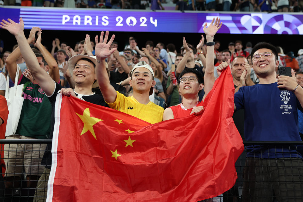 ↑7月31日,观众在比赛羽毛球混合双打四分之一决赛现场为中国选手加油。