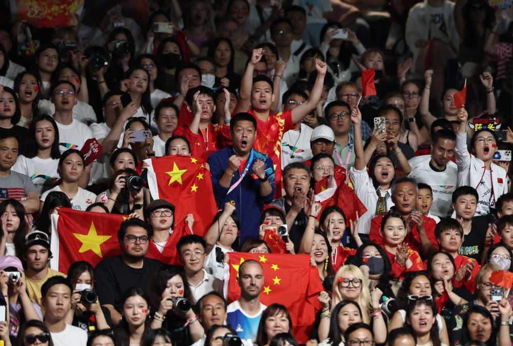 ↑7月30日,观众在巴黎奥运会乒乓球混双决赛现场加油助威。