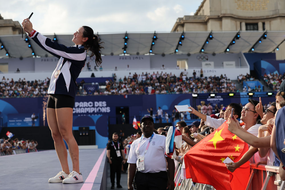 ↑8月1日,女子100米自由泳、200米自由泳季军得主中国香港选手何诗蓓在冠军公园与观众合影。
