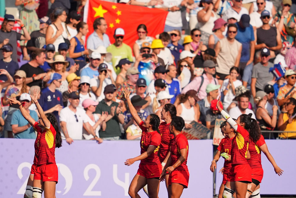 ↑7月30日,中国队选手在比赛后向观众致意。在巴黎奥运会七人制橄榄球女子五、六名排位赛中,中国队7比21不敌法国队,获得第六名。