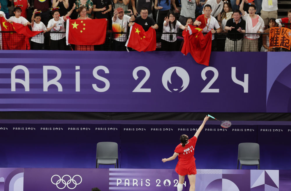↑8月2日,冠军得主中国选手黄雅琼在比赛后将羽毛球拍抛向观众。在巴黎奥运会羽毛球混合双打决赛中,中国组合郑思维/黄雅琼2比0战胜韩国组合金元昊/郑娜银,夺得金牌。