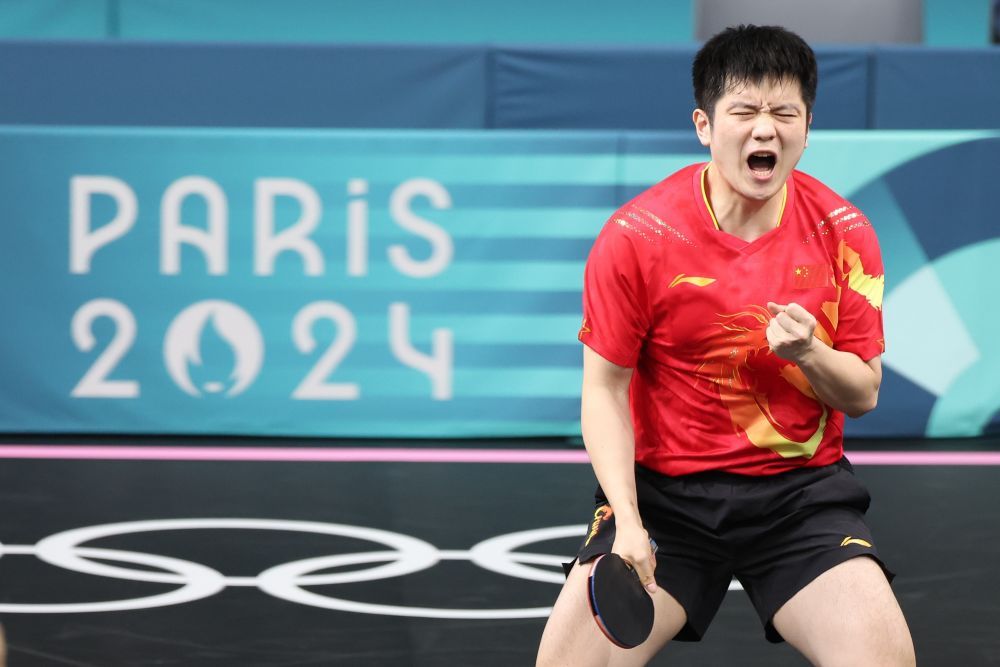 ↑8月2日,樊振东在乒乓球男单半决赛中庆祝得分。他4比0战胜法国选手菲利克斯·勒布伦,晋级决赛。