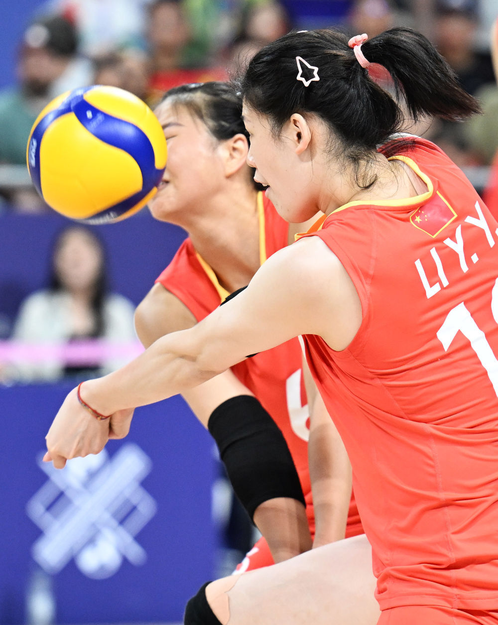 中国队球员李盈莹(右)接发球。新华社记者 刘大伟 摄