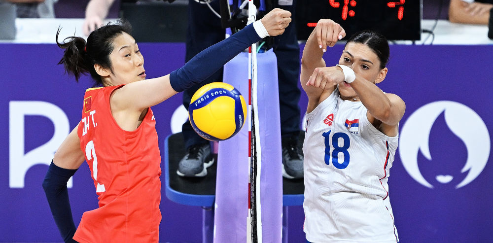 中国队球员朱婷(左)和塞尔维亚队球员博什科维奇网上争夺。新华社记者 刘大伟 摄