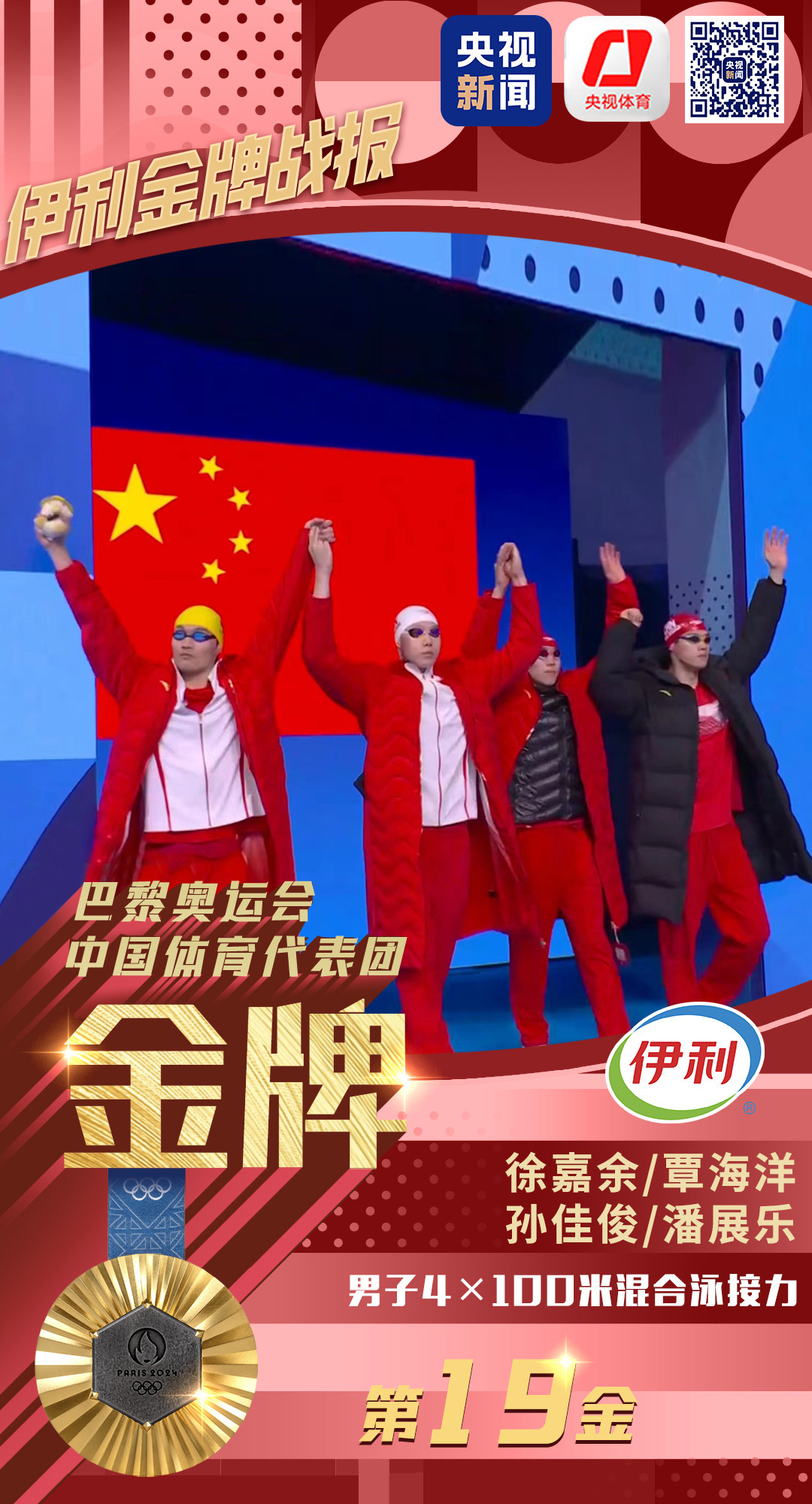 北京时间8月5日,在巴黎奥运会游泳男子4×100米混合泳接力决赛中,中国队夺得金牌。这是中国代表团在本届奥运会上获得的第19枚金牌。