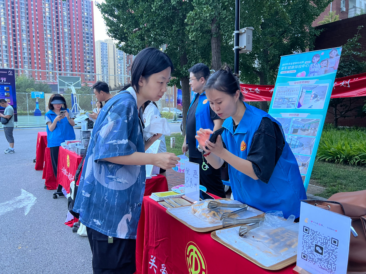 活动现场,道路两旁是整齐排列的摊位,从新鲜水果到各种奶制品,从口腔咨询到心理测试,职工日常所需的各类产品应有尽有。晨飞雁、悦康中医馆、佳宸弘、公交驾校等十几家参与经开区总工会“关爱职工伙伴计划”的商户,将包含手机维修、医疗健康、心理健康、优惠学车、健身、金融产品宣传、食品等多个类别的优惠活动或优质服务项目送到职工身边。