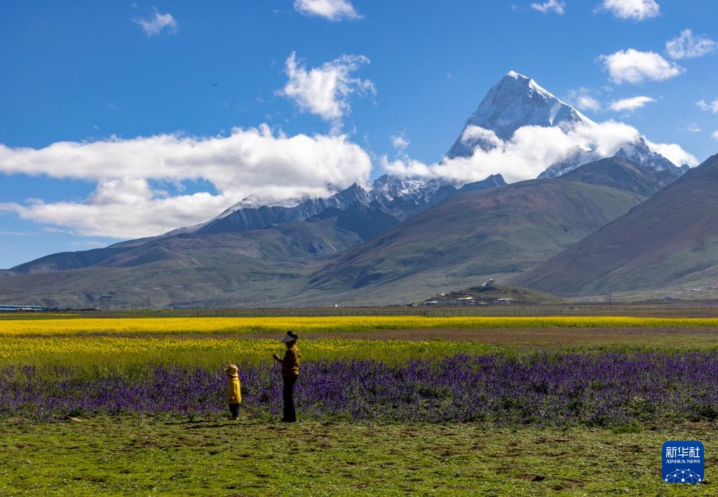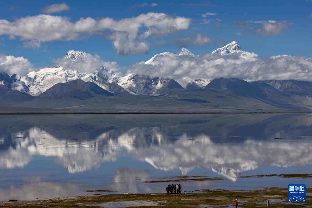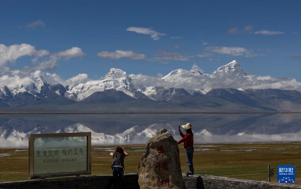 8月1日,游人在多庆错国家湿地公园拍摄卓木拉日雪山。新华社记者 姜帆 摄
