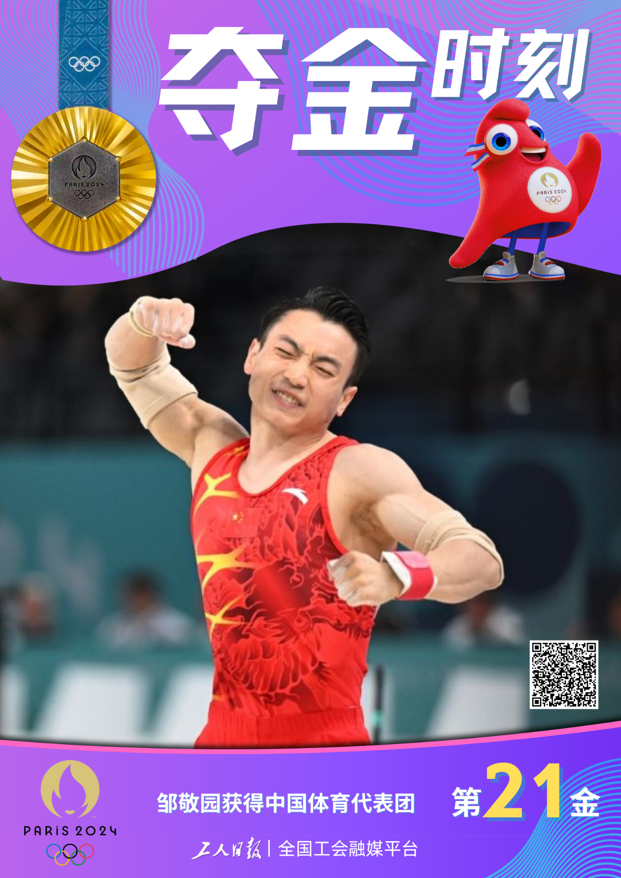 8月5日,在巴黎奥运会体操男子双杠决赛中,中国选手邹敬园夺得金牌。