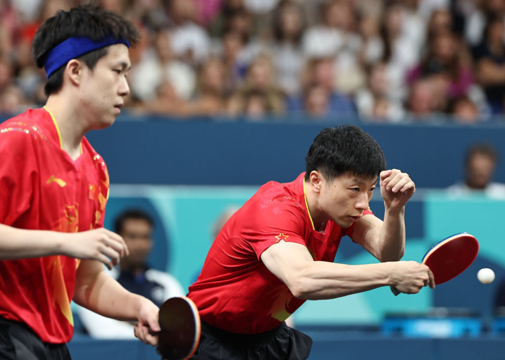 8月6日,中国队选手马龙(右)/王楚钦在比赛中。新华社记者 王东震 摄