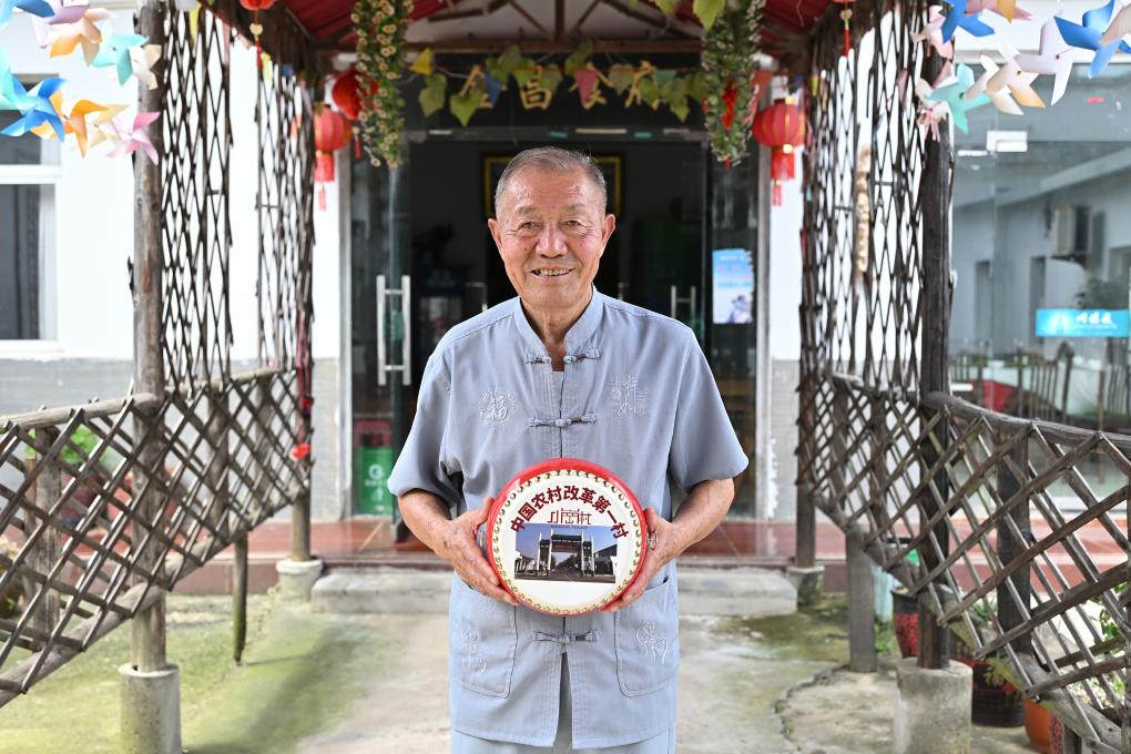 7月25日,安徽凤阳小岗村“大包干”带头人严金昌在自家开办的农家乐里展示小岗村旅游纪念品凤阳花鼓。新华社记者 李鑫 摄