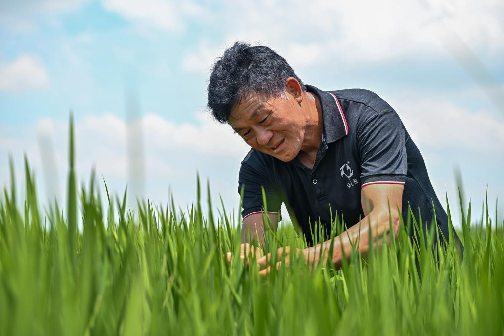 7月25日,安徽凤阳小岗村种粮大户程夕兵在田里观察水稻长势。新华社记者 李鑫 摄