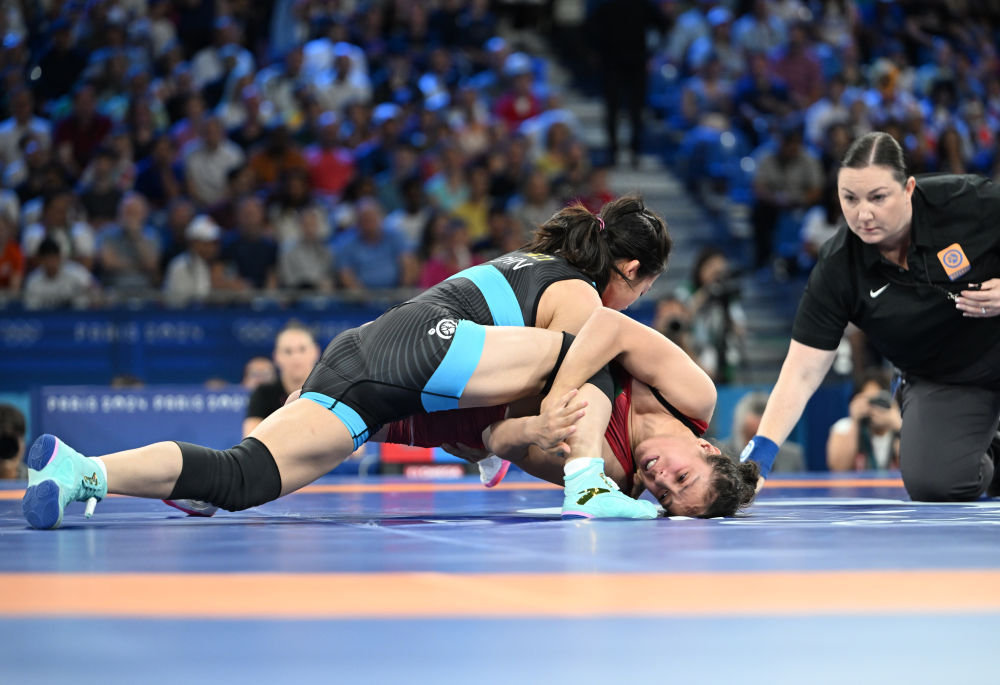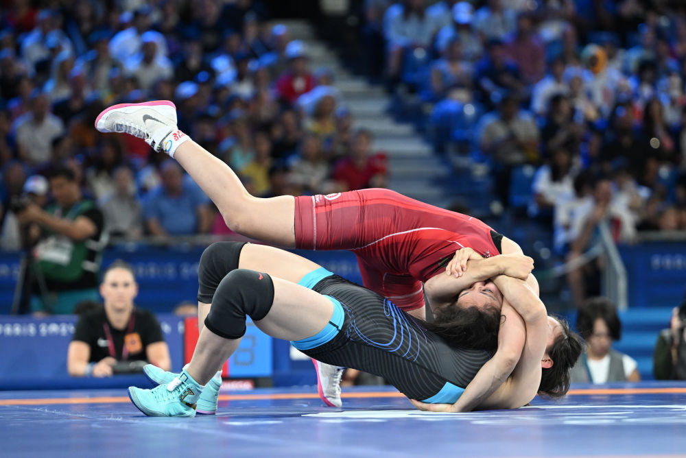8月7日,在巴黎奥运会摔跤女子自由式50公斤级复活赛中,中国选手冯紫琪战胜阿尔及利亚选手杜杜。