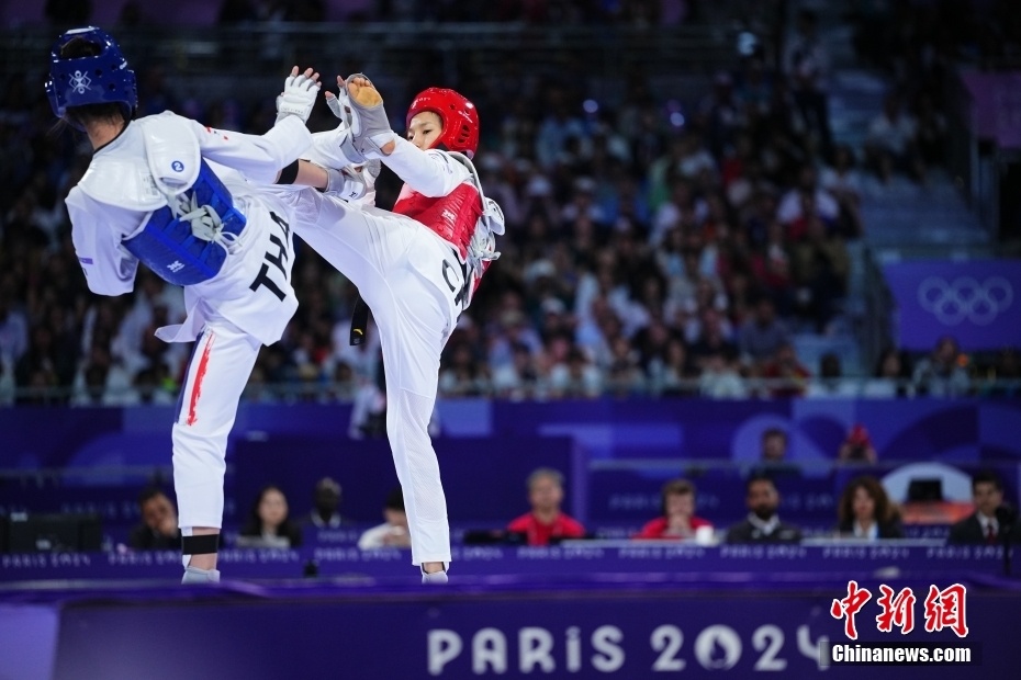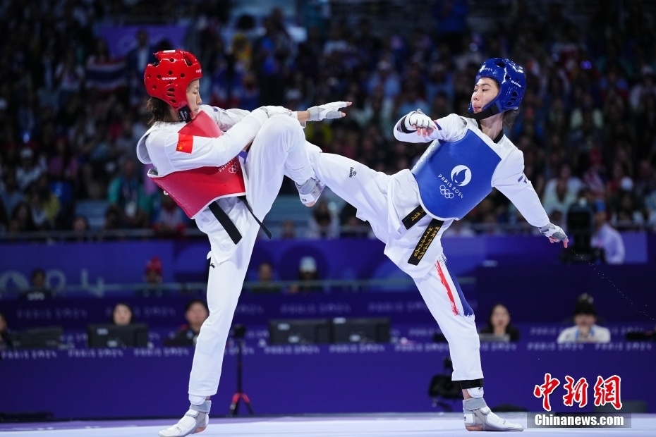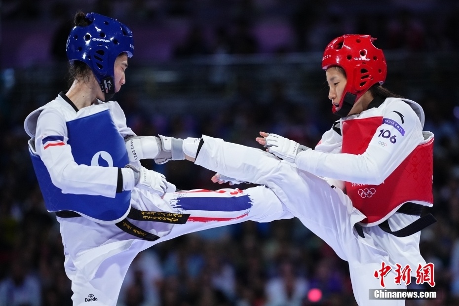 当地时间8月7日,在巴黎奥运会跆拳道女子49公斤以下级决赛中,中国选手郭清(右)不敌泰国选手巴尼巴·翁巴达那吉,获得亚军。图为双方选手在比赛中。