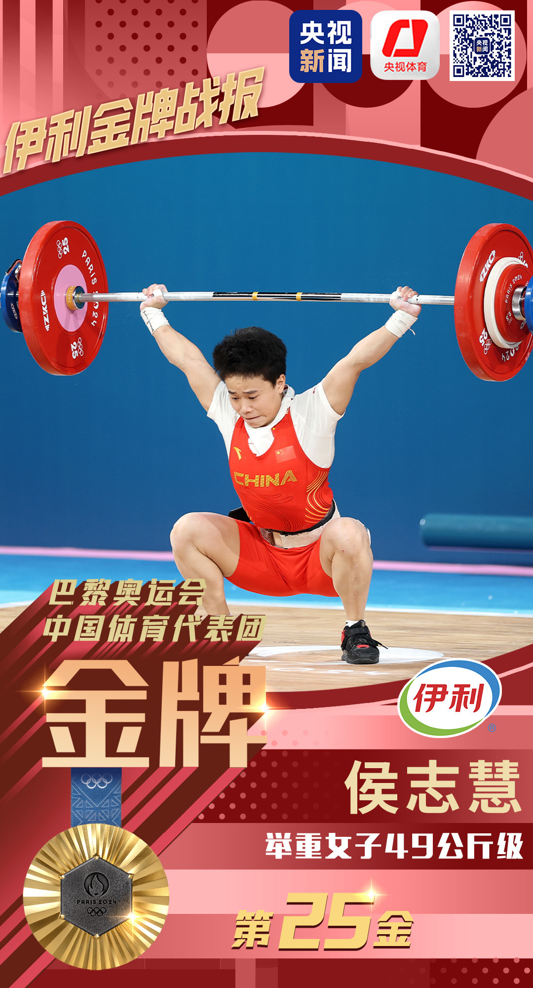 北京时间8月8日,在巴黎奥运会举重女子49公斤级比赛中,中国选手侯志慧夺得金牌,成功卫冕!这是中国代表团在本届奥运会获得的第25枚金牌。