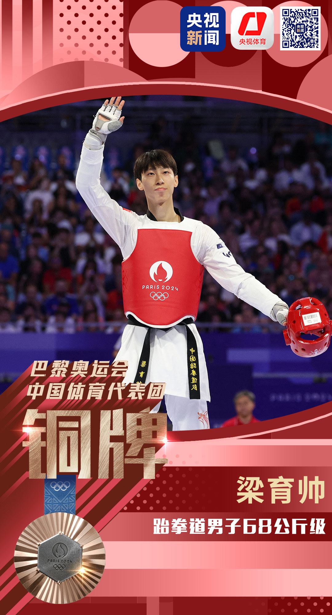 原标题:梁育帅夺得跆拳道男子68公斤级铜牌
