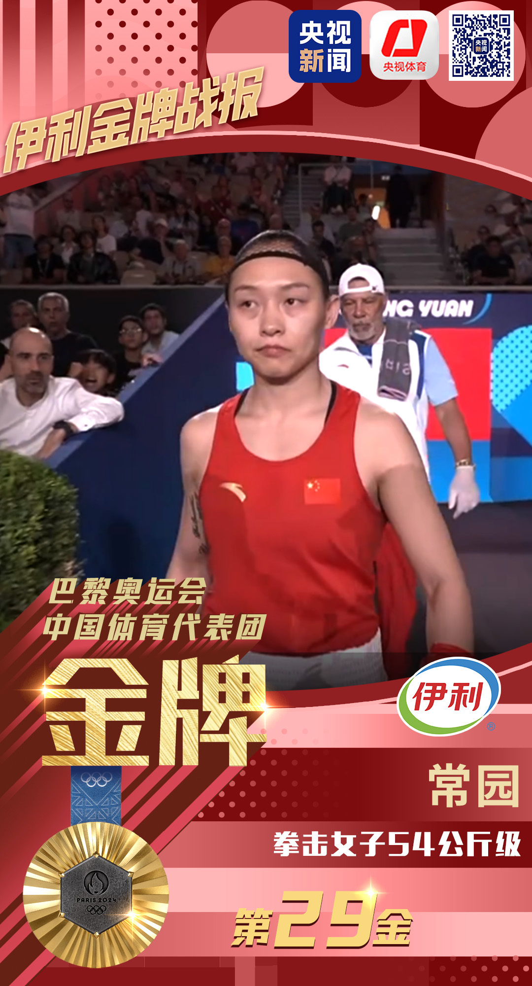 北京时间8月9日,在巴黎奥运会拳击女子54公斤级决赛中,中国选手常园战胜土耳其选手,夺得金牌。这是中国代表团在本届奥运会获得的第29枚金牌。
