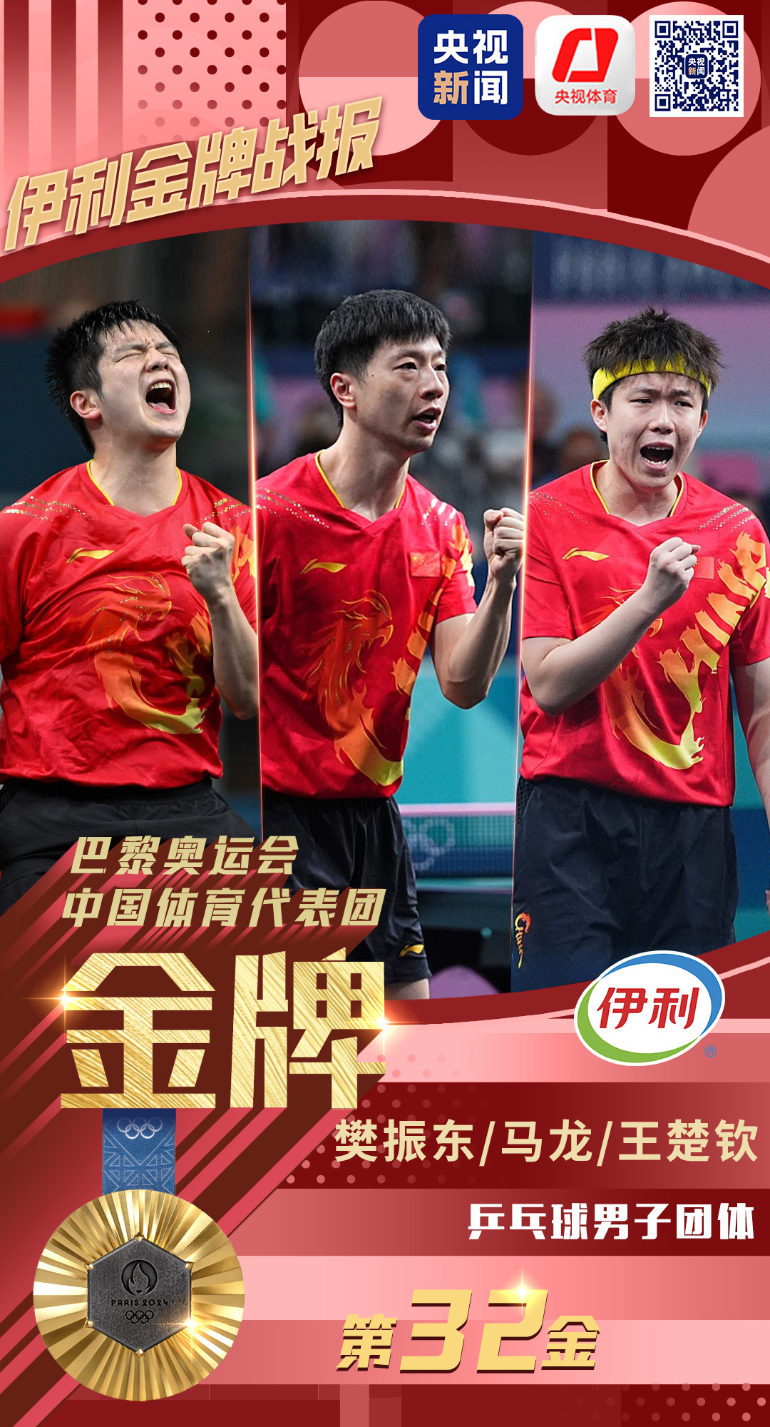 8月9日,在巴黎奥运会乒乓球男子团体决赛中,由樊振东、马龙、王楚钦组成的中国队战胜瑞典队,夺得金牌!