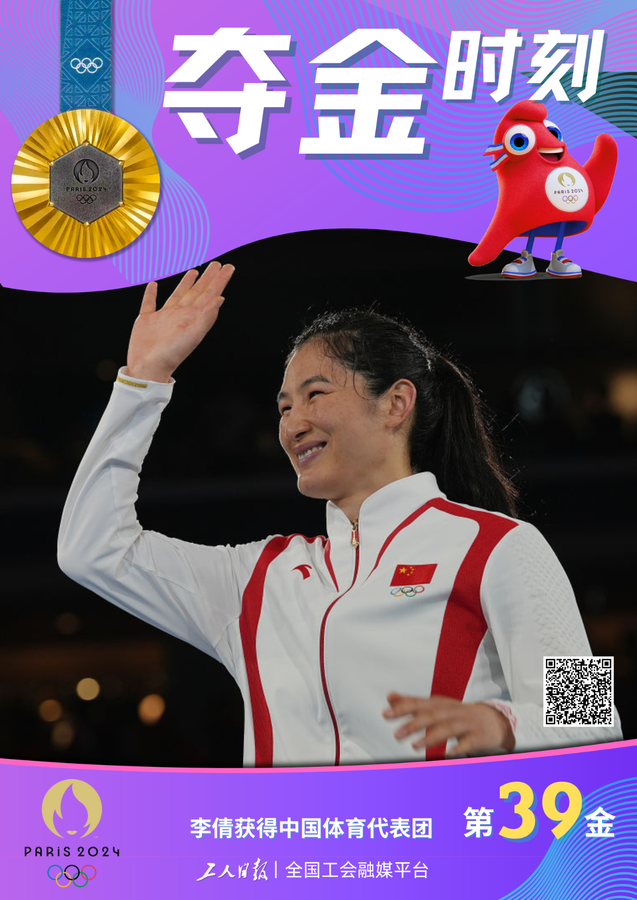 8月10日,在巴黎奥运会拳击项目女子75公斤级金牌赛中,中国选手李倩战胜巴拿马选手拜伦,夺得金牌。(图片来源:新华社 海报制作:工人日报-中工网记者 吴凡)