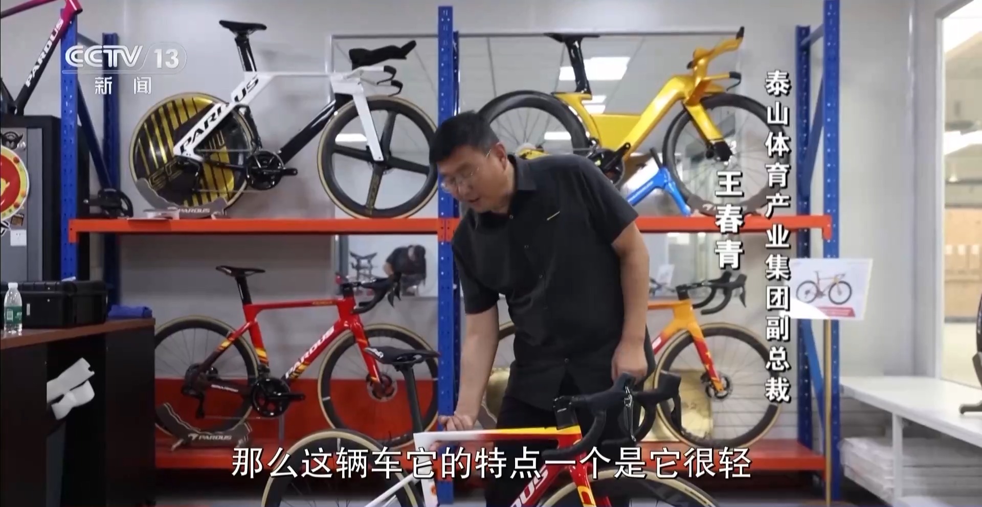泰山体育产业集团副总裁 王春青:这款战车就是今年在巴黎奥运会上吕先景和唐欣所骑乘的奥运战车。这辆车它的特点一个是很轻,一根手指轻轻地就可以挑起来。再一个这辆车我们也是专门为巴黎的路况、为运动员量身定制的,巴黎的路况有好多鹅卵石路,我们就让所有的管型尽量能够略微带有一定的减震性,让运动员在骑乘的过程中不会很疲劳。