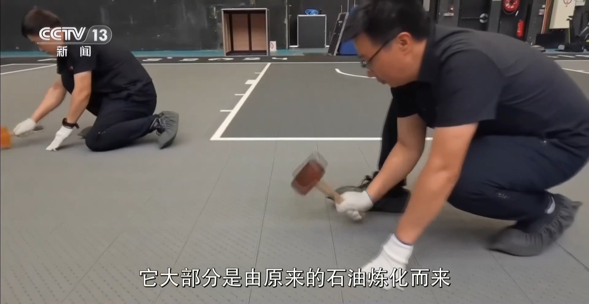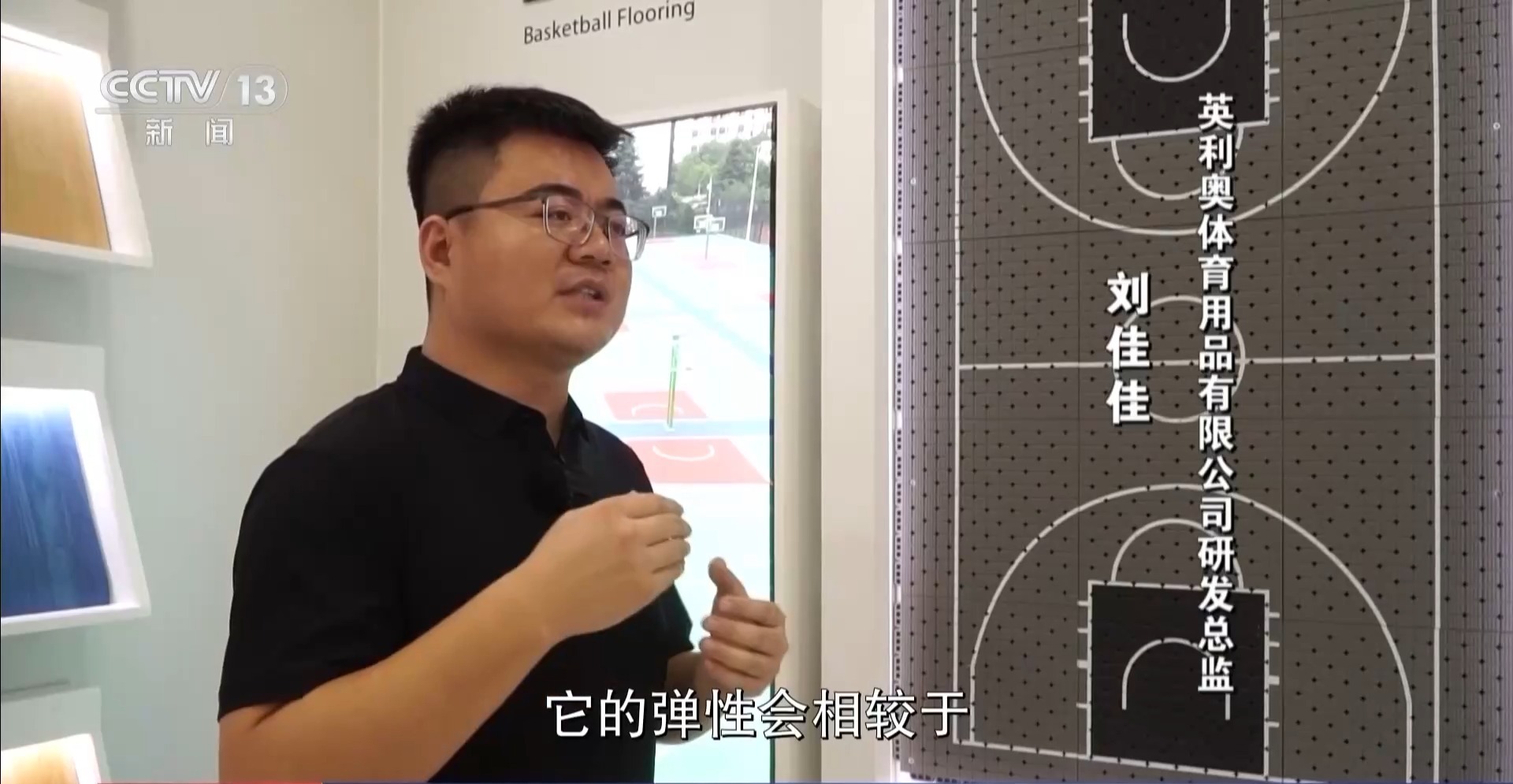 英利奥体育用品有限公司研发总监 刘佳佳:高分子材料,大部分是由原来的石油炼化而来。这个地板的原材料主要是植物来源,包括秸秆等等之类的植物来源,再聚合而成高分子材料。它的来源更加环保,同时这款产品是一种热塑性材料,将来这个产品可以重新回收再加工,加工成我们其他的产品。因为现在全球都在做可持续发展和环保的理念,都在做这件事情,我们也希望带动我们这个行业往更加环保,更加可持续发展的方向去做。