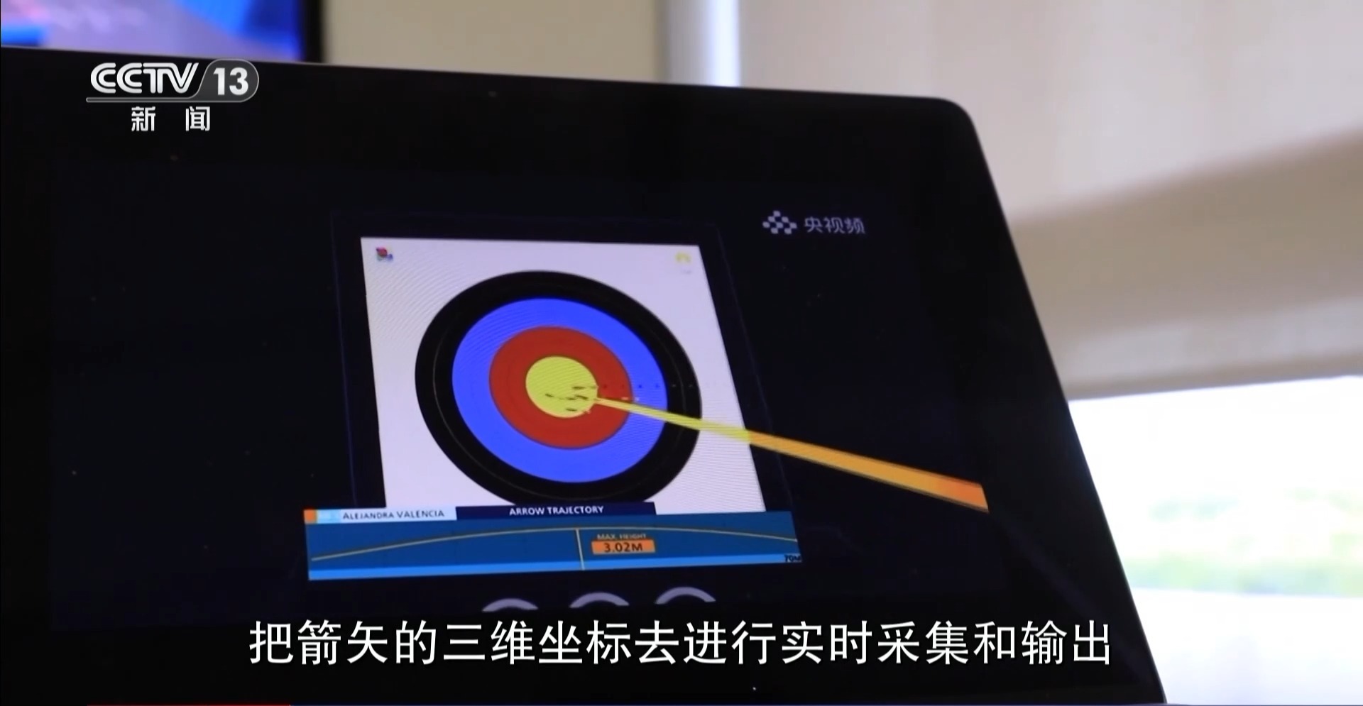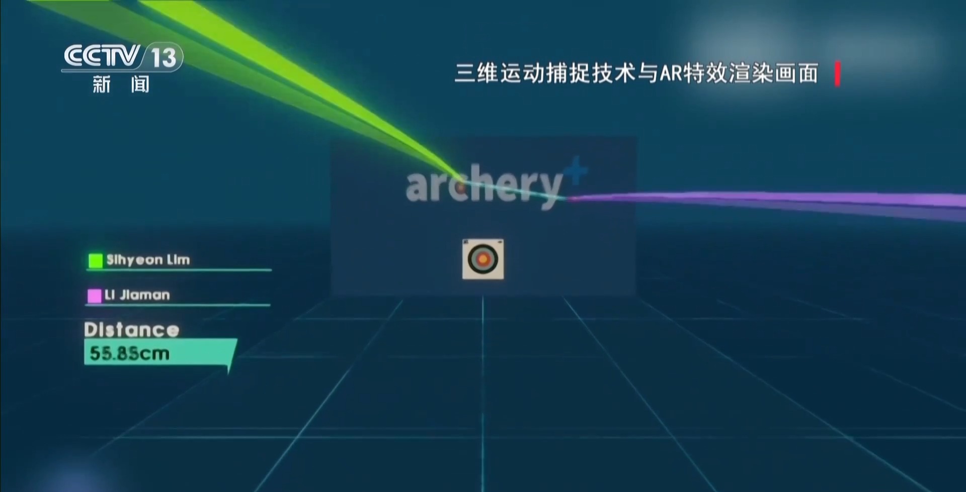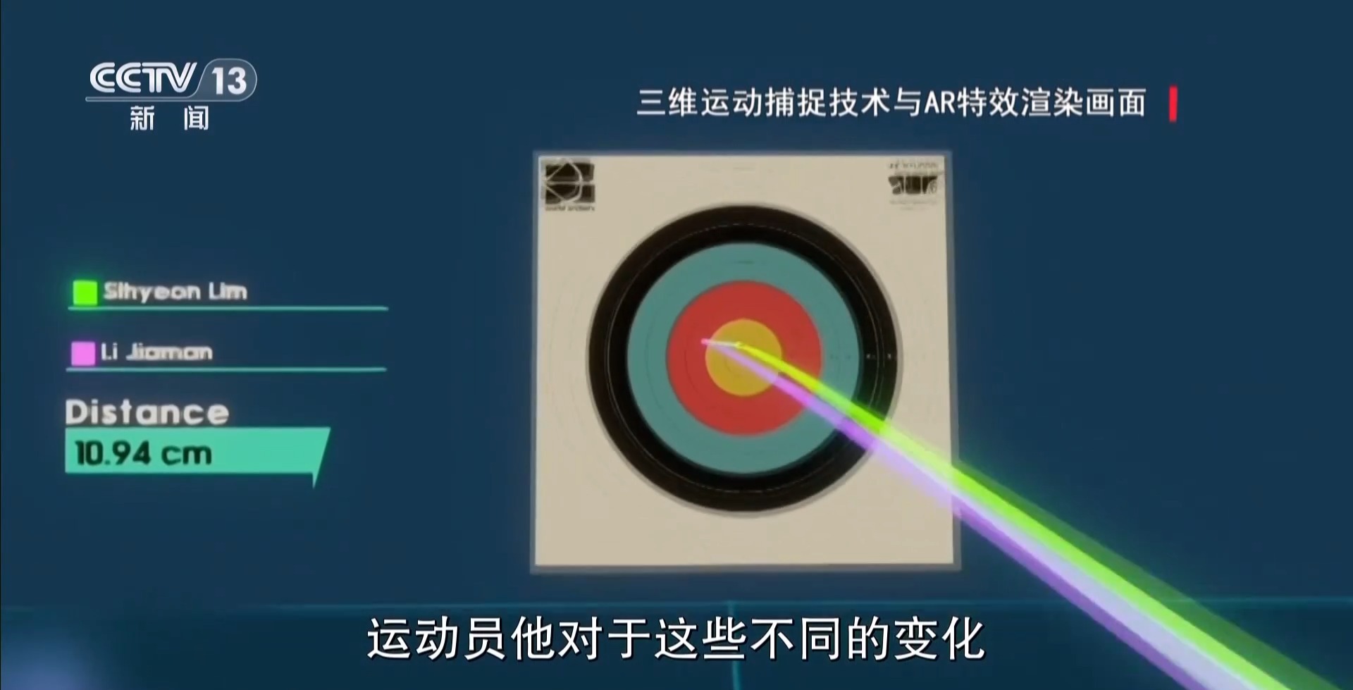 我们也通过三维运动捕捉的方式,把箭矢的三维坐标去进行实时采集和输出。在呈现效果上面,我们这边也有一个转播视频的展示,通过一种虚拟的呈现方式展现给观众,从起点到终点的这个过程,这在过去的转播过程当中其实是比较缺失的。